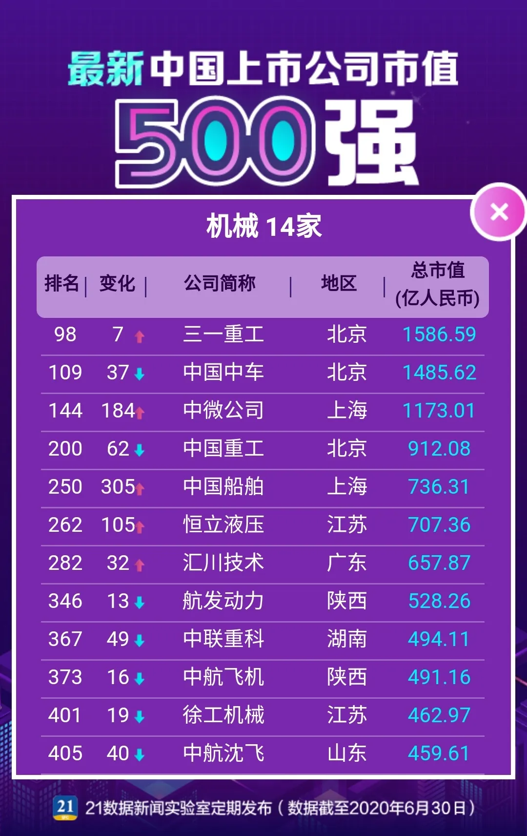 新聞實(shí)驗(yàn)室公布最新中國市值500強(qiáng)榜單。截至6月30日收盤,三一重工以1587億元市值列榜單第98位,雄居中國機(jī)械行業(yè)之首,龍頭地位穩(wěn)固。