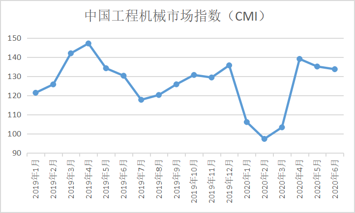 某網(wǎng)站公布的數(shù)據(jù)顯示,2020年6月份中國工程機械市場指數(shù)(CMI)為133.67,同比提高2.62%,增幅擴大;環(huán)比降低1.04%,降幅收窄(依據(jù)CMI判斷標準,130)