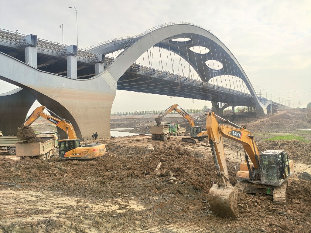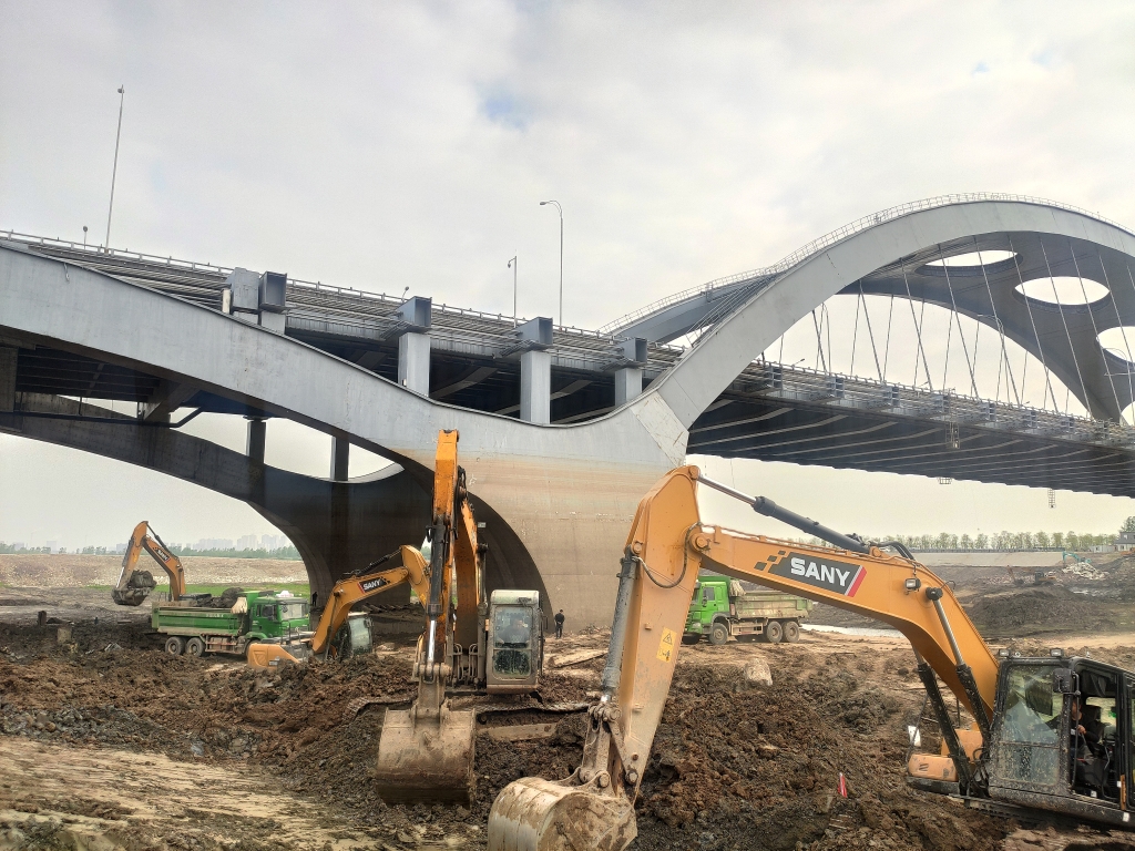 武漢長(zhǎng)江新區(qū)起步區(qū)的府澴河沿岸:1000余名建設(shè)者在此奮戰(zhàn),500多臺(tái)挖掘機(jī)、渣土運(yùn)輸車(chē)等工程機(jī)械車(chē)輛川流不息,其中,超40%的設(shè)備為三一制造。