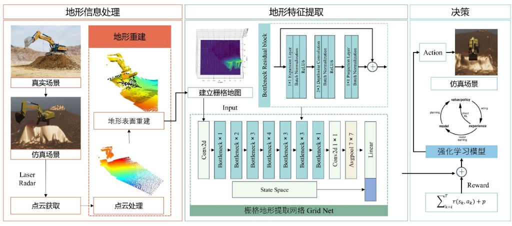 傳統(tǒng)的無(wú)人挖掘技術(shù)依賴于專家經(jīng)驗(yàn)和動(dòng)態(tài)規(guī)劃,但在效率和泛化性上存在局限。E-GTN框架通過(guò)地形特征提取和多模態(tài)融合技術(shù),基于強(qiáng)化學(xué)習(xí)和大模型架構(gòu),顯著提升了無(wú)人挖掘的決策能力和環(huán)境適應(yīng)性。該框架包括地形信息處理、地形特征提取和決策三部分。